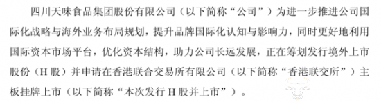 近日,天味食品发布公告称,公司拟发行H股并在香 港联交所主板上市。