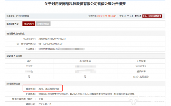 用友因出现违规失信行为,根据供应商管理相关规定,自2025年10月13日起被暂停参加全系统物资工程服务采购活动资格。暂停期内,用友法定代表人王文京、自然人控股股东控股或管理的其他企业暂停参加上述范围采购活动。