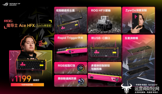 对于追求冠军同款的玩家而言,新品ROG魔导士Ace HFX ZywOo联名键盘无疑是首选。其采用双料Major冠军ZywOo亲自挑选的粉色和黄色搭配的外观设计,极具视觉冲击力。键帽设计上融入了游戏元素,包括ZywOo的个人LOGO以及大狙图案等,细节之处彰显独特个性。此外,防尘盖也特别设计了ZywOo的花纹,增添了收藏价值。