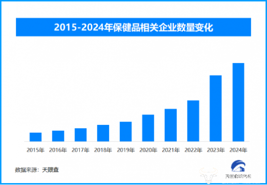 天眼查专业版数据显示,截至目前我国现存在业、存续状态的保健品相关企业超828.8万家。其中,2024年新增注册相关企业约184万余家,从企业注册数量趋势来看,近十年间,保健品相关企业的注册数量呈现出逐年增长的态势,并在2024年达到顶峰。
