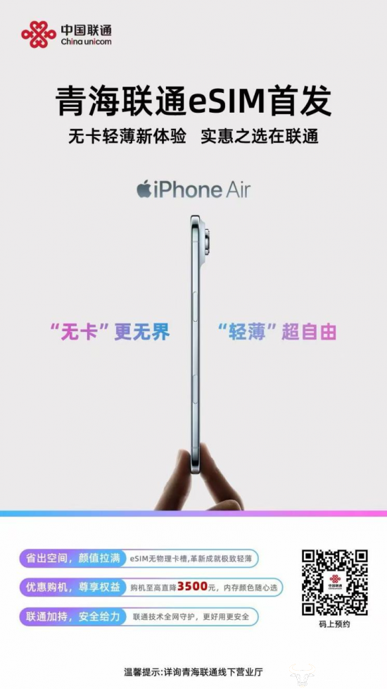 为方便用户深入了解联通eSIM业务与iPhone Air购机政策,青海联通线下营业厅可以为用户提供一对一的业务咨询、办理指导与购机服务,确保用户清晰掌握eSIM使用方法、优惠政策细则,让“无卡新体验”的落地更具温度。