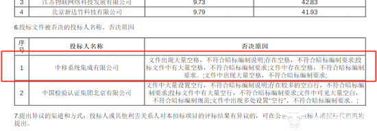 具体来看,中移系统集成公司的否决原因是“文件中出现大量空格,不符合暗标编制要求”;而中国检验认证集团北京公司则因“投标文件中有大量空行,不符合暗标编制要求”被否决。