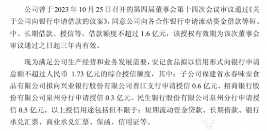 此外,安记食品今年上半年期末现金及现金等价物余额由去年同期的1.59亿元降低至1.54亿元,下降幅度不大,但安记食品在今年8月份“为满足公司生产经营和业务发展需要”,发布了向银行申请借款的公告,借款额度不超过1.6亿元。