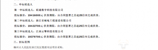 其中,中国联通旗下公司以19416000元的报价成为第一中标候选人;