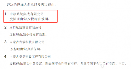 值得一提的是,根据公示,来参加投标的中移系统集成公司最终被否决,直接错失五千多万的项目,废标理由为“缺少投标有效期”,难道是投标文件中漏填了?犯的错误有点“低级”!