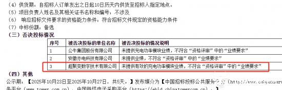 值得一提的是,该项目有三家投标单位被否决,其中,公牛集团未提供充电功率模块业绩被否决;而超聚变数字技术有限公司因未提供有效的充电功率模块业绩,不符合资格评审中的业绩要求,也被否决投标。