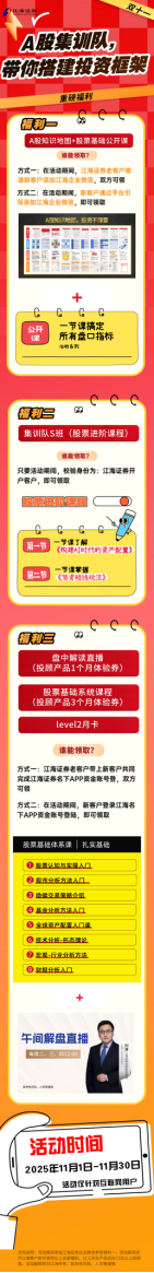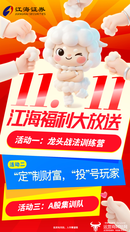 11月不只有购物车,更有你的“财富升级计划”!江海证券将于11月1日至11月30日推出以“江海福利大放送”为主题的的系列投教活动,通过提供涵盖“龙头战法训练营”、“‘定’制财富,‘投’号玩家”和“A股集训队”三大板块的体系化投教内容,旨在为不同层次的投资者提供实实在在的投资“装备”。