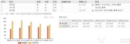 而谢金菱2024年薪酬为74.72万元,相较于2023年的68.66万元,上涨了6.06万元,仅次于其父亲谢庆奎。谢庆奎薪酬由2023年的73.12万元上调至81.52万元,增长了8.40万元。当然,作为创始人父女,他们的股权比薪酬更值钱。