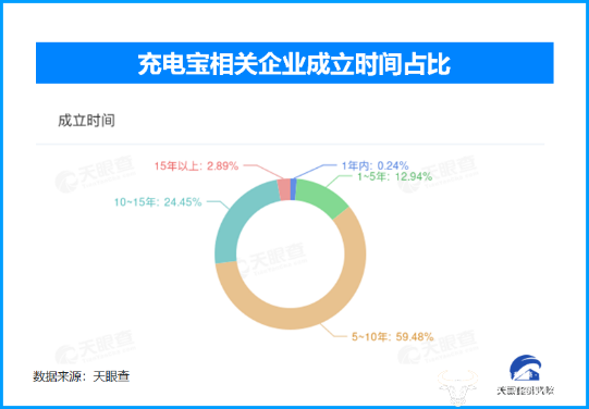天眼查专业版数据显示,截至目前我国现存在业、存续状态的充电宝相关企业超1.6万家。从区域分布来看,广东省充电宝相关企业数量位居首位。从成立时间来看,59.45%的企业成立于5-10年之间,而成立10-15年的企业占比也已达到了24.45%。