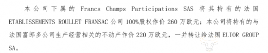 今年6月份,张裕发布公告称,公司下属的Francs Champs Participations SAS将其持有的法国ETABLISSEMENTS ROULLET FRANSAC公司100%股权作价260万欧元,同时,公司将持有的与法国富郎多公司生产经营相关的不动产作价220万欧元,一并转让给法国ELIOR GROUP SA,合计作价480万欧元,约为人民币3931.97万元。