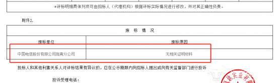 值得一提的是,项目废标情况显示,中国电信陇南分公司因无相关证明材料被废标,具体是什么证明材料并未说明。难道是因为报价不合理?