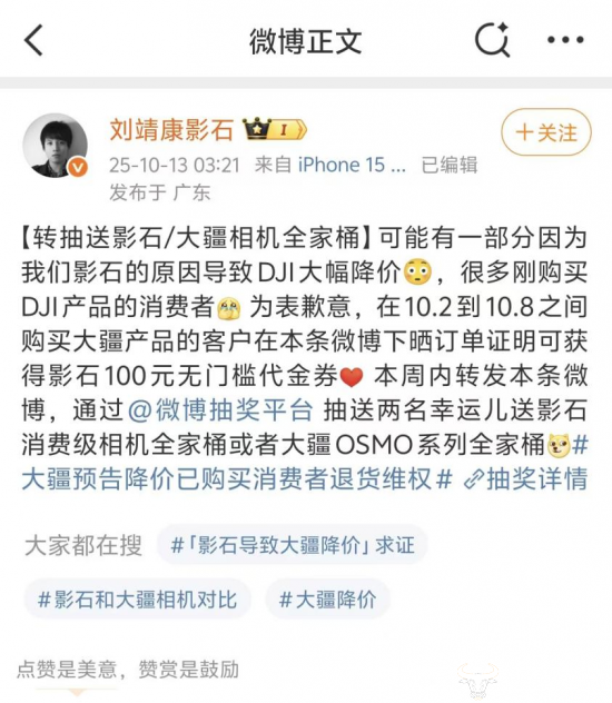 10月13日凌晨,影石创新CEO刘靖康发文称“可能有一部分因为我们影石的原因导致大疆大幅降价”,并表示为10月2日至10月8日期间购买大疆产品的消费者提供100元无门槛代金券,用户晒订单即可领取,同时还发起转发抽奖,奖品包括影石消费级相机全家桶或大疆OSMO系列全家桶。