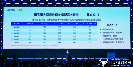 发布会上,深度推理大模型讯飞星火X1.5正式亮相。星火X1.5采用MoE架构,总参数量293B、激活30B,推理效率相比星火X1提升100%。它的语言理解、文本生成、知识问答、逻辑推理、数学能力、代码能力等六大核心能力全面对标国际主流,其中数学能力持续保持国际领先。其多语言能力覆盖超过130个语种,整体性能达到GPT-5的95%以上,其中拉美、东盟等14个重点语言效果领先,为世界提供了AI发展的“第二选择”。