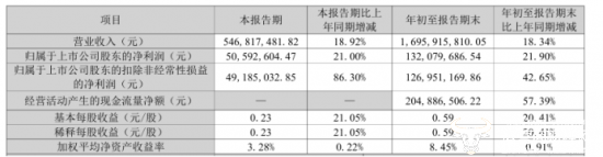 西麦食品三季度财报显示,公司今年前三季度实现营业收入16.96亿元,同比增长18.34%,归母净利润为1.32亿元,同比增长21.90%。其中公司第三季度单季度实现营业收入5.47亿元,同比增长18.92%,归母净利润同比增长21%至5059.26万元,营收和利润双双增长,保持了业绩的上涨态势。
