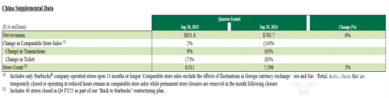 此外,星巴克中国2025财年第四季度同店销售额同比增长2%,同店交易量同比增长9%,新增183家门店,而截至2025财年末,星巴克中国门店数达8011家,共进入1091个县级市场。