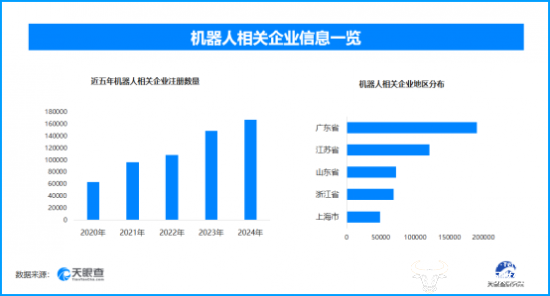 天眼查专业版数据显示,截至目前我国现存在业、存续状态的机器人相关企业超99.9万家。其中,2025年截至目前新增注册相关企业约20.6万余家,从企业注册数量趋势来看,近五年间,机器人相关企业的注册数量呈现出逐年增长的态势,并在2024年达到顶峰,为超16.7万余家。