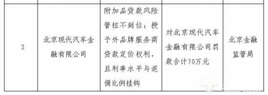 据了解,北京现代金融公司之所以被罚,一是因为附加品贷款风险管控不到位,二是因为授予外品牌服务商贷款定价权利,且利率水平与返佣比例挂钩,被罚款合计70万元。