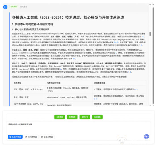 新版本在功能深化、体验升级与场景拓展等方面均有显著提升。生成内容图文并茂、报告输出格式更规范,能提供互联网模式、论文库模式、自定义模式等多种研究模式选择。从“自动分析研究主题、规划调研计划、深度搜索信息源到分析调研结果、产出研究报告”全流程仅需10-15分钟。