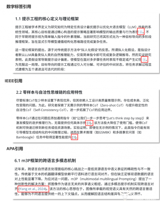 另外,报告内容支持用户查看引用来源,方便追溯AI生成内容的原始依据,验证信息的真实性和有效性,减少“学术幻觉”现象,确保生成内容的可靠性。并且,论文库模式下,研究报告支持3种引用格式,涵盖APA和IEEE两种国际标准引用格式,可以满足不同学科领域的引用规范要求。同时,研究报告支持导出word或pdf格式,满足用户的多样化使用和存档需求。