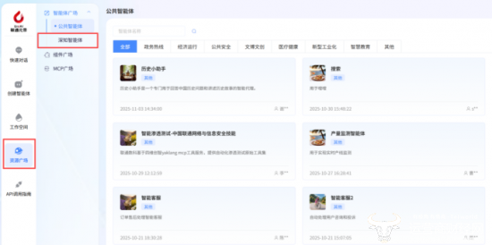 1.入口:进入元景大模型MaaS平台(https://maas.ai-yuanjing.com/),注册登录后,点击首页“用模型”,选择“资源广场——深知智能体”即可进入页面。