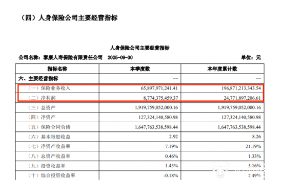 从财务上来看,泰康人寿的表现也非常不错。前三季度其保险业务收入实现1968.71 亿元,在非上市人身险企中位居第一,较 2024 年同期同比增长 3.77%。