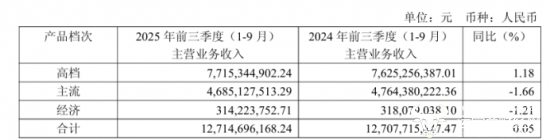 对此,重庆啤酒总裁李志刚在业绩说明会上表示,受外部环境影响导致行业整体承压,当前市场整体仍面临压力,但公司“高档酒板块的持续增长已成为明确的积极信号”。财报数据显示,重庆啤酒中高档产品前三季度实现收入77.15亿元,同比增长1.18%,是公司三个档次产品中,唯一实现正增长的产品类别。