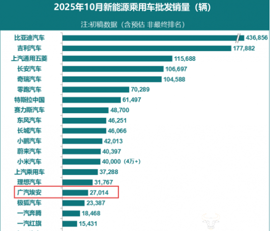 今年前十个月,广汽埃安累计销售新车20.96万辆,较上一年同期的26.49万辆下降20.87%。据了解,在乘联会发布的2025年10月新能源乘用车厂商批发销量排名中,广汽埃安已经排到了第16位。