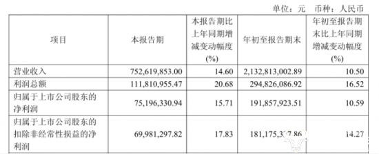 而财报数据显示,宝立食品前三季度实现营业收入21.33亿元,同比增长10.50%,归母净利润为1.92亿元,同比增长10.59%。其中第三季度公司营业收入为7.53亿元,同比增长了14.60%,归母净利润同比上升15.71%至7519.63万元,保持了业绩的增长态势。