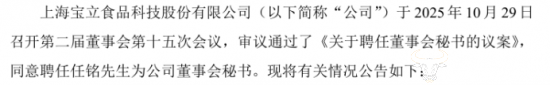 2020年加入宝立食品,担任公司董事会秘书兼财务总监,而在2023年,因工作调整原因,任铭辞去公司董事会秘书职务,但仍担任公司的财务总监,由李潇涵接任董秘一职。直至今年10月份,任铭再次兼任公司董事会秘书职务。