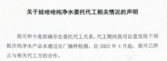 此外,在今年5月份,娃哈哈找今麦郎代工饮用水事件引发热议,而娃哈哈在回应中提到,因代工期间公司自查发现个别批次纯净水产品未通过出厂抽样检测,已于2025年4月终止与相关代工方的合作。