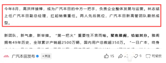 根据广汽本田公众号文章介绍,“今年8月,高洪祥接棒,成为广汽本田的中方一把手,负责企业整体发展与运营。林志斌上任广汽本田副总经理,扛起销售重任。”由此可见,林志斌上任已有一段时间,将主要负责销售业务。