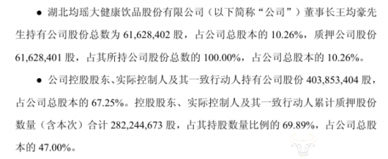 值得注意的是,均瑶健康近期发布公告称,董事长王均豪将其持有的6163万股股份进行质押展期,占其所持股份的100%,而截至公告披露日,公司控股股东及其一致行动人累计质押股份2.82亿股,占其持股比例的69.89%,超过了五成。