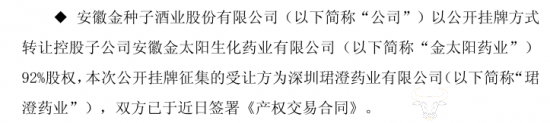此外,金种子酒近日发布公告披露,公司通过公开挂牌方式转让持有的金太阳药业92%的股权,该股权最终由深圳珺澄药业有限公司以1.26亿元摘牌受让。而此前首次挂牌价格定为1.4亿元,但因未能征集到符合条件的有效意向受让方而导致流标,为推进交易落地,金种子酒以首次挂牌价的90%确定二次挂牌底价,并由珺澄药业成功摘牌。