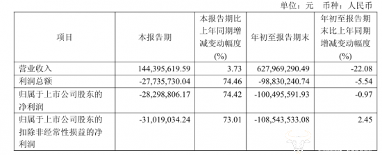 财报数据显示,金种子酒前三季度营业收入为6.28亿元,同比下降22.08%,归母净利润为-1.00亿元,亏损同比扩大0.97%,营利均有所下降。而在第三季度公司实现营业收入1.44亿元,同比增长3.73%,归母净利润为-2829.88万元,同比收窄74.42%,但仍为亏损状态。