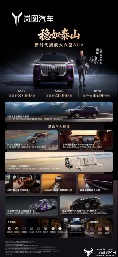 岚图泰山背靠东风56年造车底蕴,是岚图顶级整车技术与华为智能科技的集大成者,新车以“泰山”为名,致敬沉稳担当、勇于肩负时代使命的精神。同时,岚图泰山也是岚图汽车向港交所提交上市申请书后发布的第一款产品,新车上市引发行业广泛关注与认可。积极的外部反馈,证明岚图汽车能够发挥“央国企”的稳健特质与“高端新能源”成长属性,拥有打入高端汽车产业核心圈层的体系能力,进一步强化了市场信心。