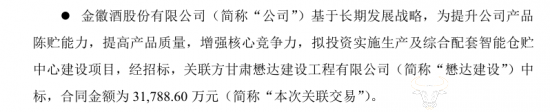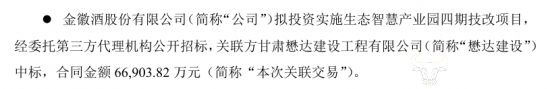 今年4月份,金徽酒发布公告称,公司生态智慧产业园四期技改项目经第三方代理机构公开招标,由关联方甘肃懋达建设工程有限公司中标,公司拟与其签订《工程施工合同》,合同金额约为6.69亿元。