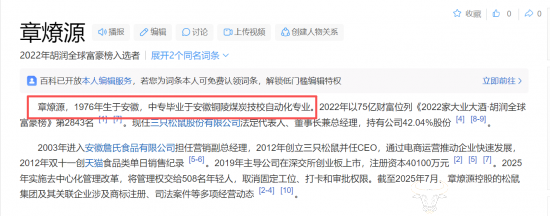 天眼查显示,章燎源1976年出生,中专学历。百度百科显示,章燎源中专毕业于安徽铜陵煤炭技校自动化专业;三只松鼠的上市公司资料则显示,章燎源中专学历。