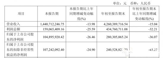 而第三季度单季度ST绝味营业收入为14.41亿元,同比下滑13.98%,归母净利润同比减少26.46%至1.05亿元,营收和利润双双下降,未能改善公司的盈利情况。