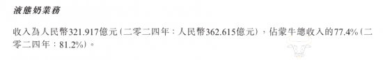 据蒙牛乳业发布的2025年中期业绩报告,蒙牛集团今年上半年收入为415.67亿,本期利润为21.54亿元,毛利率同比提升1.4个百分点至41.7%。其中核心业务液态奶今年上半年收入为321.92亿元,占总营收的77.4%。