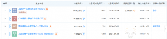 天眼查显示,此次融资由仙乐健康领投,高瓴创投与蒙牛创投跟投,融资将主要用于研发体系升级、产品矩阵拓展和市场教育深化。而此轮融资完成之后,公司的注册资本增加5105万元至1.7亿元,蒙牛仍为迈胜的绝对大股东,持有公司近六成的股份,仙乐健康控制的广东仟佰大健康产业有限公司持股16.6667%,是公司第二大股东,高瓴创投持股10.0024%,是第三大股东。
