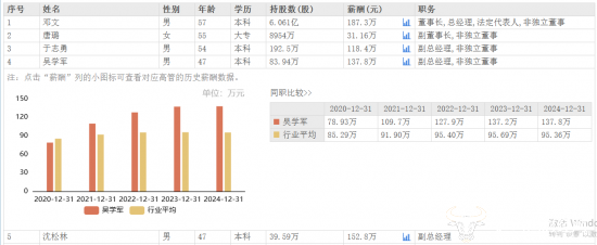 可以看出吴学军在天味食品工作了近二十年,积累了丰富的销售与营销经验。吴学军2024年薪酬为137.8万元,相较于2023年的137.2万元,仅微增了0.6万元,是公司高管中涨薪幅度最小的,低于另一副总经理沈松林,后者2024年薪酬为152.8万元,比吴学军高了15.0万元。