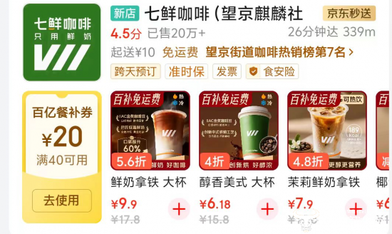 目前,七鲜咖啡已上线京东外卖页面,多款咖啡原价在15至25元,补贴后价格多在10元以下,其中醇香美式补贴后仅售6.18元,可以看出,七鲜咖啡选择了低价策略来打开市场。