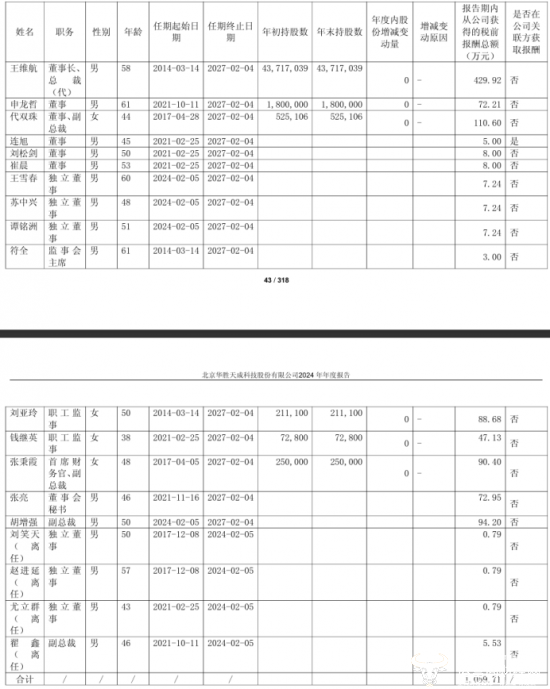 2024年财报显示,公司董事、监事和高级管理人员2024年薪酬总额1,059.71万元,而王维航的年薪为429.92万元,占总薪酬的40.57%,位居高管薪酬首位。仅次于他的是副总裁代双珠,她去年的年薪是110.6万元,二者相差319.32万元。