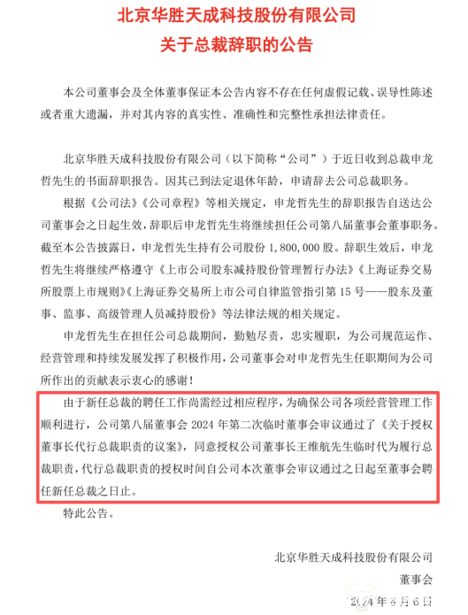 2024年8月,华胜天成公告,由于总裁申龙哲的辞任,授权董事长王维航临时代为履行总裁职责至聘任新总裁之日止。