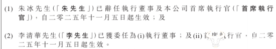 公告显示,由于其他业务承担及工作安排之缘故,朱冰辞任公司执行董事及首席执行官职务,辞任后,朱冰将不再担任公司内任何职位,而首席执行官一职由李清华接任。