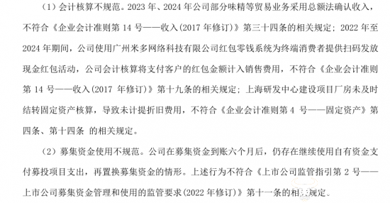 公告显示,安记食品会计核算不规范,存在部分贸易业务采用总额法确认收入、将支付客户的红包金额计入销售费用、未及时结转固定资产核算等不规范行为。此外,公司在使用募集资金方面也存在一定问题,在募集资金到账六个月后,仍存在继续使用自有资金支付募投项目支出,再置换募集资金的情形。