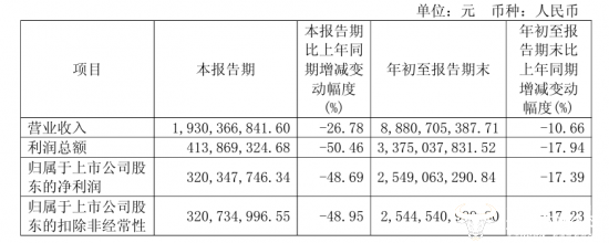 而第三季度单季度今世缘营业收入为19.30亿元,同比下滑26.78%,归母净利润同比下降48.69%至3.20亿元,公司盈利能力承压。
