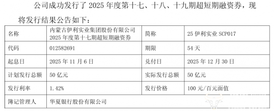 公告显示,伊利股份成功发行了2025年度第十七、十八、十九期超短期融资券,规模分别为50亿、55亿、35亿元,合计共140亿元,计划全部用于补充营运资金,期限统一设定为54天,兑付日为2025年12月30日,发行利率为1.42%,低于行业平均水平。