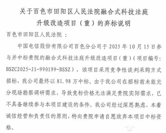 2025年11月7日,百色市田阳区人民法院发布的一则采购结果更正公告显示,此前以81.98万元低价中标的中国电信股份有限公司百色分公司,因“报价无法满足实际建设需求”弃标,项目最终顺延给报价91万元的百色移动,这一操作让项目延期近一个月。