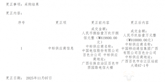 最终,2025年11月7日的更正公告显示,百色移动以91万元的报价“捡漏”中标,项目总金额较电信原报价高出近10万元。此时距离最初招标已过去两个多月,原定的项目进度因此被打乱。